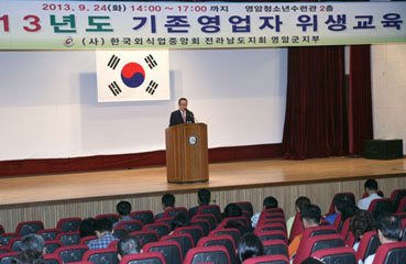 군은 ‘2013 영암 F1국제자동차경주대회’와 ‘왕인국화축제’의 성공적인 개최에 대비하고 음식문화 개선과 식품위생업소의 경쟁력을 강화하기 위해 군 청소년수련관에서 관내 일반음식점 영업주 580명을 대상으로 위생교육을 실시했다. 이번 교육은 한국외식업중앙회 영암군지부(지부장 김영범) 주관으로 식중독 예방의 중요성과 식품위생법에 대한 해설, 서비스 개선을 위한 친절교육, 국제행사 대비 ‘남도좋은식단’ 음식문화개선사업 홍보 등 위생분야 전반에 대해 실시됐다.