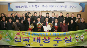 보건복지부가 11월28일 The-K 서울호텔 본관 2층 가야금홀에서 실시한 ‘2013년도 지역복지 우수 지방자치단체 시상식’에서 군이 ‘지역사회복지계획 시행결과 평가’에서 대상과 ‘대한민국 복지행정상’ 노인복지분야 우수기관으로 각각 선정, 영예의 복수 기관표창과 함께 6천만원의 포상금을 받았다.