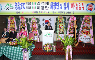 영암FC는 지난 12월19일 영암읍 우정웨딩컨벤션에서 영암군생활체육회 김영환 회장을 비롯한 각급 기관사회단체장과 회원가족 등 150여명이 참석한 가운데 회장단 이·취임식을 가졌다. 이날 새로 취임한 이용만 회장은 “성실을 바탕으로 선후배들의 의견을 충분히 수렴 하겠다”며 “축구 경기를 통해 우호의 폭을 넓히고 풍부한 인간관계를 유지해 나갈 수 있도록 최선을 다해 최고의 축구 클럽이 될 수 있도록 노력 하겠다”고 포부를 밝혔다.