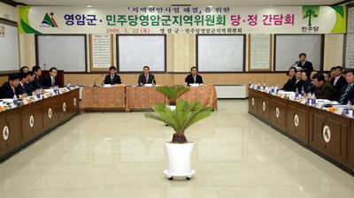 이날 간담회는 군 역점사업의 홍보물 상영을 시작으로 군관계자의 2009년 예산현황과 영암읍 소도읍 육성,소각장및 매립장,삼호고등학교 설립, 도갑사 집단시설지구 이전등 9건의 지역현안사업의 설명과 2010년도 국민체육센터 건립, 외국인 근로자 지원 센터 건립등 국고 지원요청 건의 사업 21건 1천7백76억원의 지속적인 예산 반영을 위해 당과 국회차원의 지원을 건의 했다.