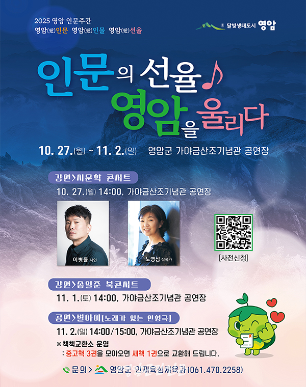 이번 인문주간은 ‘영암애(愛) 인문·인물·선율’을 주제로, 문학·역사·철학 등 다양한 인문학 분야를 음악 감수성과 결합한 3색 강연과 공연으로 풀어낸다.