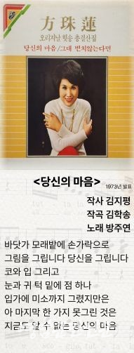 ‘당신의 마음’은 영산강이 막히기 전 바닷물이 드나들던 너른 영암천 바닷가 모래밭을 추억하며 썼던 곡이다. 작사상을 수상한 김지평 선생은 심사위원으로 참여한 무애(無涯) 양주동(梁柱東) 박사로부터 노랫말의 아름다움에 대해 크게 찬사를 받는다.