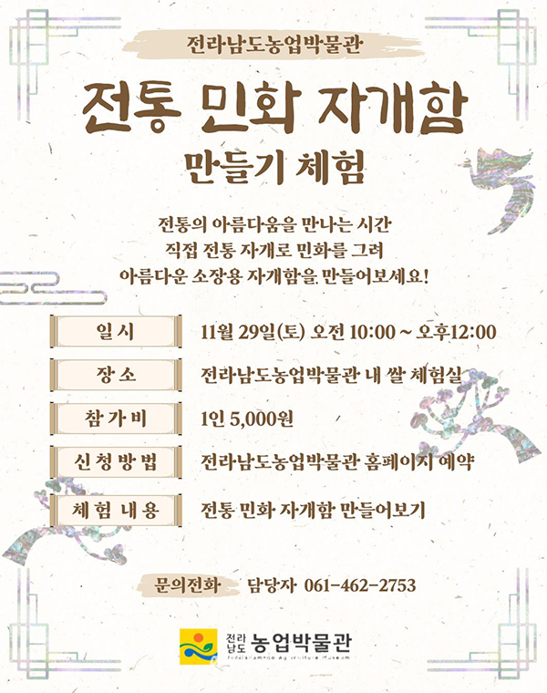 김옥경 전남도농업박물관장은 “민화와 자개라는 전래 공예를 직접 체험함으로써 전통문화의 아름다움과 가치를 재발견하는 뜻깊은 체험이 될 것”이라며 “앞으로도 다양한 체험 프로그램을 통해 지역 주민이 전통문화를 즐기고 배우는 박물관의 문을 활짝 열겠다”고 말했다.