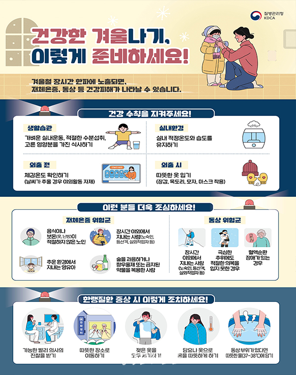어린이와 어르신은 일반 성인에 비해 체온유지에 취약하며, 심뇌혈관·당뇨병·고혈압 등 만성질환자는 급격한 온도 변화에 따라 혈압이 급격히 상승하는 등 증상이 악화할 수 있어 각별한 주의가 필요하다.