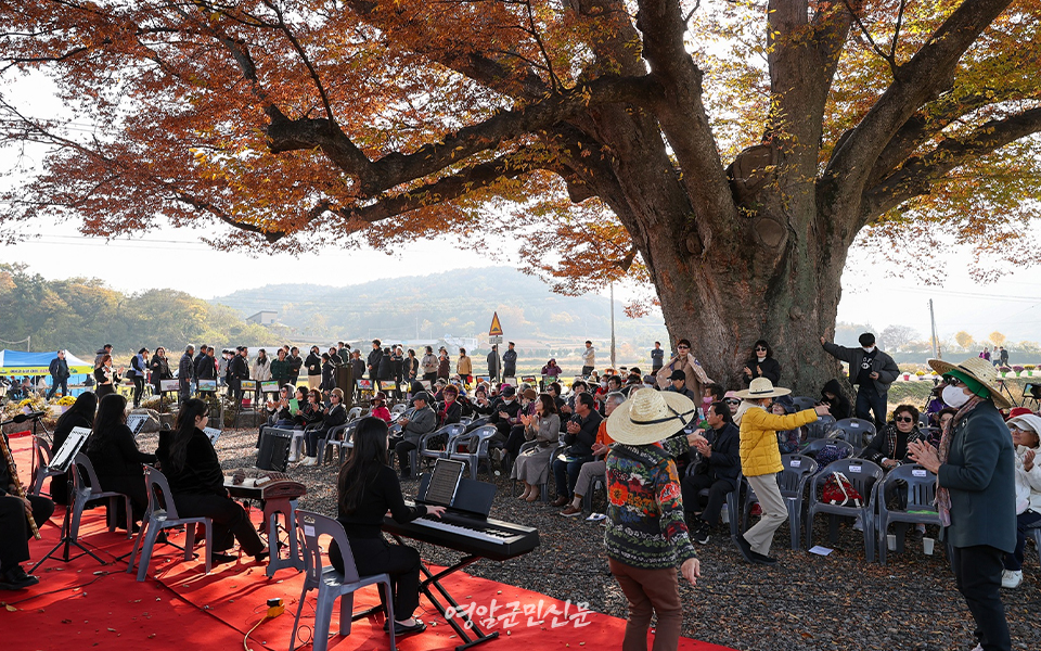 추수를 마친 들판에 우뚝 서 있는 800년 넘는 보호수 느티나무 아래서 펼쳐진 이 음악회에는 마을주민과 관광객 등 400여 명이 함께 해 늦가을의 정취에 흠뻑 빠졌다.