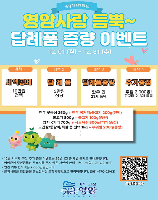 이영주 영암군 홍보전략실장은 “영암군 고향사랑기부에 보내 준 성원에 보답하기 위해 11월에 이어 12월에도 더욱 풍성한 혜택을 마련했다. 영암군 농·특산물의 우수성을 널리 알리고 기부자 만족도를 높일 수 있도록 다양한 프로그램을 지속 추진하겠다”고 말했다.