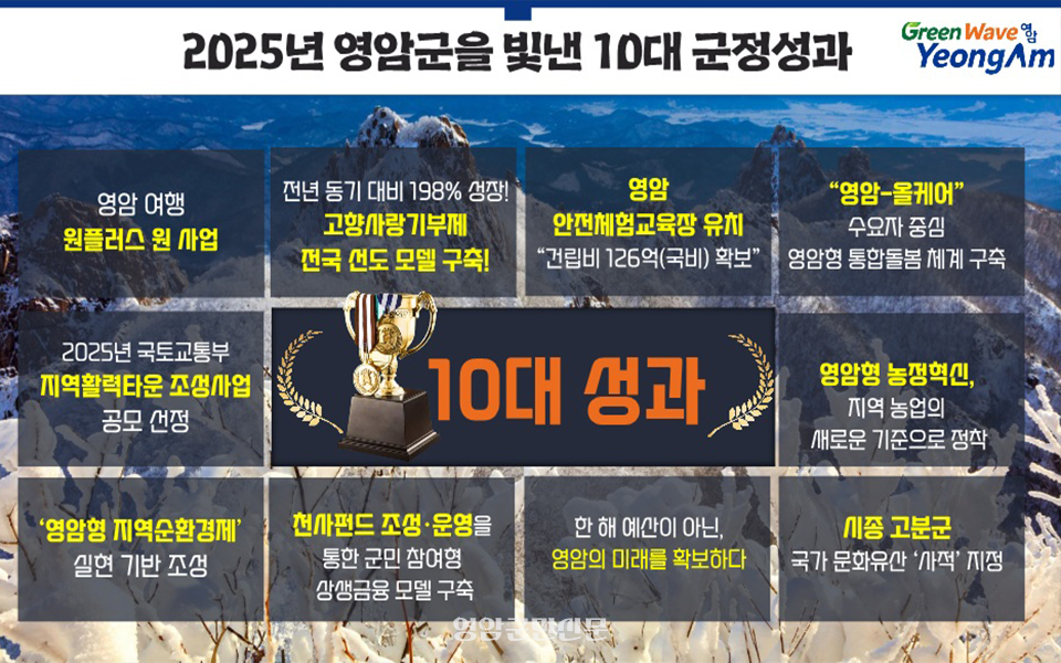 고향사랑기부제 활성화도 올해를 대표하는 정책으로 꼽혔다. 영암군은 기업·단체 대상 찾아가는 기부 이벤트와 지역 농특산품 중심의 답례품 전략을 병행해 지역과의 접점을 넓혀왔다. 그 결과 2023년 전국 3위, 2024년 전국 4위에 이어, 2025년 12월 30일 기준 전년 동기 대비 200% 이상 모금 증가라는 성과를 기록했다.