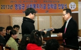 자치/행정 영암군민신문304호2013. 12.06군은 지난 12월4일 군청 낭산실에서 관내 저소득층 자녀 13명에게 ‘2013년도 사회복지기금 장학금’ 1천400만원을 전달했다.기초수급가정, 조손가정, 차상위계층 등 저소득층 자녀들이 경제적 어려움으로 학업을 중단하는 사례가 없도록 하기 위해 전달된 이날 장학금 지급대상은 홍민표(전남대 1년) 학생 대학생 5명과 고등학생 5명, 중학생 3명 등이다.김일태 군수는 이날 전달식에서 “어려운 환경이지만 면학을 게을리하지 말고 각자의 위치에서 성실하게 생활하고 건전한 사회인으로 성장해 미래 영암군 발전에 ...