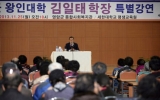 자치/행정 이춘성 기자303호2013. 11.29김일태 왕인대학장 특별강연, 복지정책 비전 제시 왕인대학 학장인 김일태 군수가 지난 11월25일 군 종합사회복지관에서 왕인대학생 120여명이 참석한 가운데 특별강연을 했다. 김 군수는 이날 강연에서 “영암 군정에 보내주신 여러분들의 관심과 사랑, 참여 덕분에 최근 영암이 모든 분야에서 정말 빠르게 변하고 발전해 나가고 있으며, 특히 노인복지분야가 전국 최우수군으로 우뚝 솟은 것은 우리 영암군의 위상을 보여주는 것”이라고 말했다.또 “어르신들의 삶이 즐겁게 변화되고 아름다운 노후를 행복하게 보내시는데...