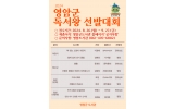교육 노경하 기자2024. 09.09영암군도서관이 ‘제28회 영암군 독서왕 선발대회’를 열고, 9/27일까지 독후감상문을 모집한다. 영암군민 누구나 참여할 수 있는 이번 대회는, 영암군과 전남도립도서관이 선정한 ‘올해의 책’ 8권 중 1권을 읽고 독서감상문을 작성해 제출하는 방식으로 진행된다. 올해의 책과 제출 서류 목록은 영암군도서관 홈페이지 ‘공지사항’을 보거나, 영암도서관(061-470-6802)로 문의하면 된다. 시상은 초등부, 중등부, 고등부, 일반부로 나누어 총 16명을 선발해 한다. 독서왕의 감상문은 ‘제32회 전라남도 ...