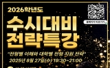 교육 영암군민신문2025. 11.06영암군진로진학지원센터는 오는 8월 27일 저녁 7시30분 청소년센터에서 ‘2026학년도 수시 대비 전략특강’을 진행한다. 이날 특강은 대학입시 수시전형을 준비하는 고등학생과 입시생, 학부모 등에게 맞춤형 전략을 제시하기 위해 마련됐다. 특강에는 정제원 상담교사가 ▲교과·종합·논술 전형별 특징과 유의점 ▲수시 6회 지원 전략 ▲3학년 2학기 수험생활 관리법 등을 예시와 함께 설명한다. 정 교사는 한국교육방송공사(EBS) 입시 대표 강사, 서울교육청 대학진학지도지원단 상담교사로 활동 중이다. 영암지역 고등학생, 학...