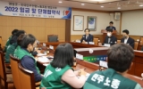 지역사회 이승범 기자2023. 02.17영암군 소속 공무직 노동자를 대표하는 전국민주연합노동조합 영암군지부(지부장 박민주)는 12월 12일 군청 낭산실에서 '2022년 임금 및 단체협약식'을 가졌다. 이날 협약식에는 우승희 군수와 박민주 영암군지부장, 김정숙 여성부지부장을 비롯한 14명의 교섭위원이 참석했다. 단체교섭에서 민주연합노조는 행정직원 기본급 3% 인상과 도로·환경 호봉증액, 행정·현장 사무분장 등을 요구했다. 이에 대해 군은 기본급의 경우 행정·도로·환경직원 2.5% 인상으로 조정수...